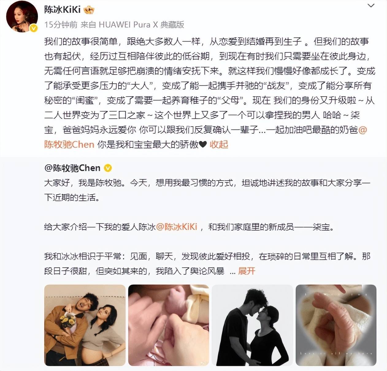 陈牧驰晒出与陈冰的孕肚合照以及一家三口碰拳照,正式宣布得子喜讯。他写道:“给大家介绍一下我的爱人陈冰,和我们家庭里的新成员——柒宝。”陈冰转发并回应:“一起加油吧最酷的奶爸,你是我和宝宝最大的骄傲。”